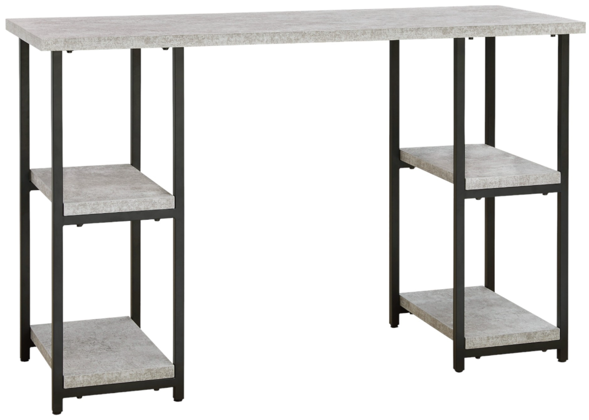 Casual linear style is ideal to keep your home office aesthetic appealing and clean. This desk features an architectural look with its faux concrete MEGA-TUFF® melamine top and a metal base in a dark pewter-tone finish, for the perfect balance of crisp and cool. The double-shelf pedestal design offers additional storage space.Read More