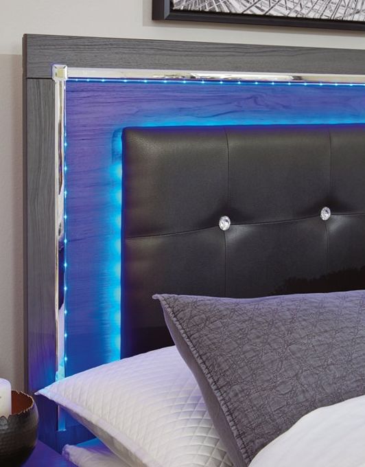 Headboard has biscuit tufting, faux-leather upholstery, LED color accent lighting, and remote control